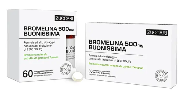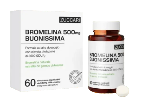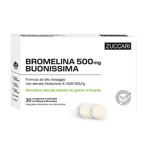Contiene Bromelina 500 mg per compressa con attività proteolitica certificata (2500 GDU/g), indice di elevata concentrazione ed efficacia.