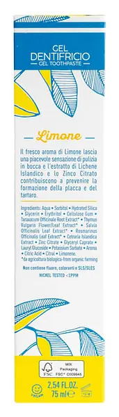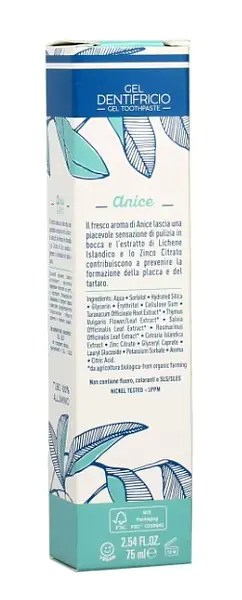 Dentifricio vegetale in gel con Lichene Islandico e Zinco Citrato che interferiscono nella proliferazione dei batteri e aiutano a prevenire la formazione della placca e il deposito di tartaro.