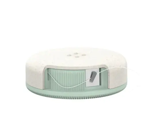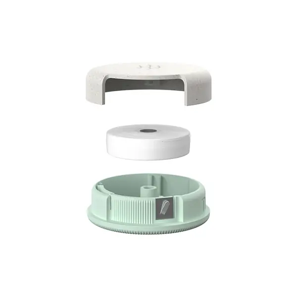 Il coperchio e la base del dispenser sono realizzati in bioplastica a base di olio di pino ottenuto da un processo secondario della produzione di legno e carta.