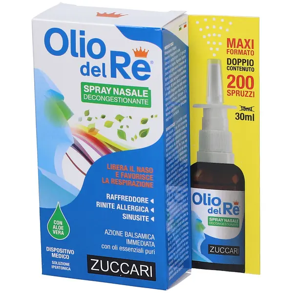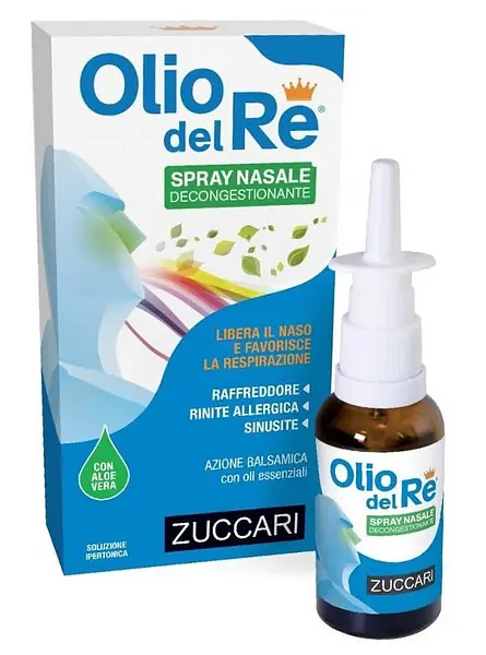 Olio del Re spray nasale decongestionante è un dispositivo medico costituito da una soluzione ipertonica a pH fisiologico arricchita con oli essenziali puri e gel d’Aloe vera.