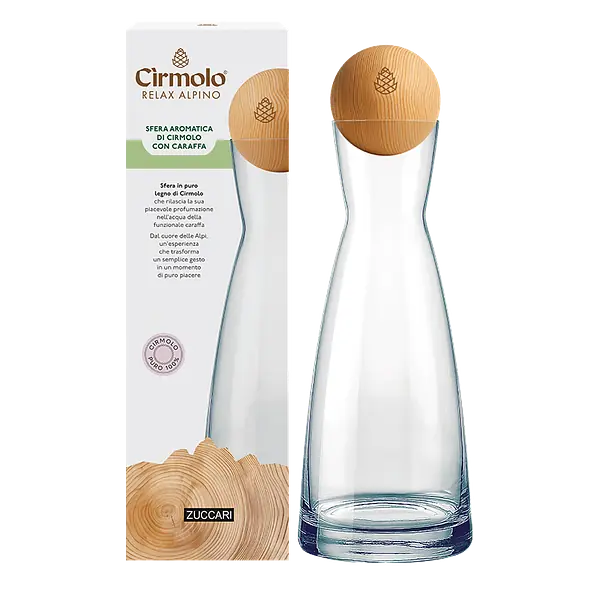 Set composto da una sfera in legno di Cirmolo e da una caraffa in vetro borosilicato, progettato per migliorare la qualità dell’acqua e aromatizzare naturalmente gli ambienti.