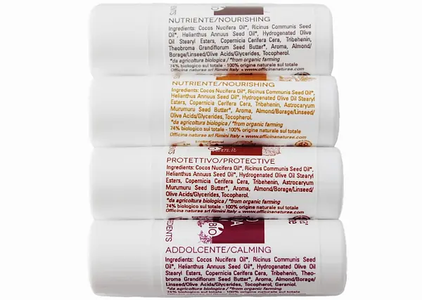 Non contengono burro di cacao, ma burri vegetali ad azione protettiva ed emolliente e mix di oli vegetali ad azione rigenerante, idratante e lenitiva.