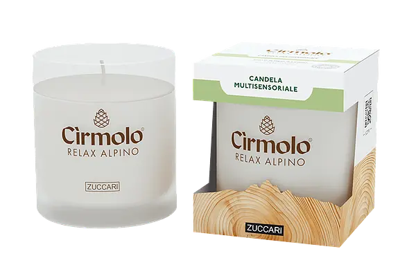 La Candela Multisensoriale al Cirmolo è realizzata con cera di soia, che garantisce una combustione pulita e uniforme, e arricchita con Olio essenziale puro di Cirmolo.