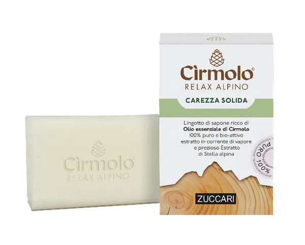 Sapone solido naturale formulato con Olio essenziale di Cirmolo ed estratto di Stella Alpina, pazientemente saponificato come da tradizione.