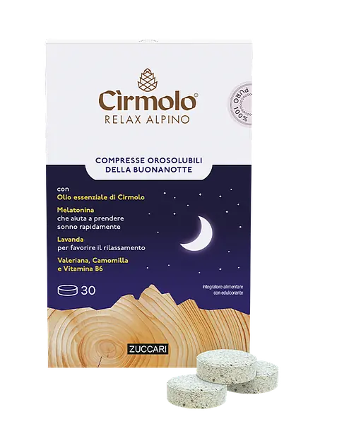 Compresse orosolubili dal gusto piacevole, pensate per accompagnare la fase dell’addormentamento e sostenere il rilassamento naturale, grazie alla combinazione di Melatonina, piante officinali e all’aroma unico del Cirmolo.