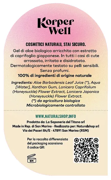 Gel di Aloe biologico arricchito con estratto di Caprifoglio giapponese. In tutti i casi di cute arrossata, irritata e disidratata. Dermatologicamente testato su pelli sensibili. Senza profumi.