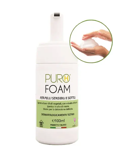 Schiuma detergente a base di oli vegetali, con estratto di fiori di iperico in olio di neem. Ideale per la detersione delicata della pelle sensibile e sottile.