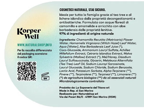 Ideale per tutta la famiglia grazie al Tee Tree e al Lichene islandico dalle proprietà decongestionanti e antibatteriche. Formulato con acque floreali di Camomilla e Amamelide e arricchito con Aloe barbadensis dalle proprietà lenitive.