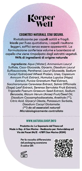 Ingredients: Aqua [Water], Ammonium Lauryl Sulfate, Coco-Glucoside, Glycerin, Disodium Lauryl Sulfosuccinate, Panthenol, Lauryl Glucoside, Sodium Cocoyl Hydrolyzed Wheat Protein, Urea, Capsicum Annuum Fruit Extract, Humulus Lupulus (Hops) Extract, Punica Granatum Peel Extract, Saccharomyces Cerevisiae Extract, Salvia Officinalis (Sage) Leaf Extract, Serenoa Serrulata Fruit Extract, Trigonella Foenum-Graecum Seed Extract, Sodium Benzoate, Illicium Verum (Anise) Fruit/Seed Oil, Disodium Cocoamphodiacetate, Anethole(**), Citric Acid, Glyceryl Oleate, Potassium Sorbate, Disodium Cocoyl Glutamate. (**) da oli essenziali naturali